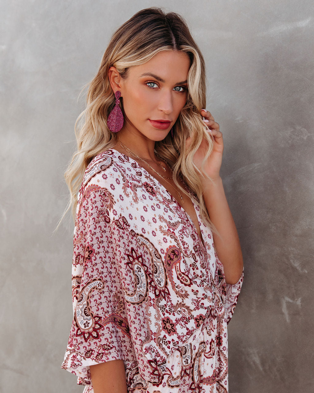 Our Zell Beaded Teardrop Earrings complete your event look! These 3 inch burgundy teardrop statement earrings are secured with a push backing. The perfect addition to a fancy dress and heels. Styled with the North Star Layered Necklace and Keep My Love Paisley Kimono Dress.